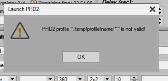 I have no idea where the weird .!temp came from, but this refers to the PHD2 profile that you have asked SGPro to use when a sequence starts. You should be able to correct it just by going to the setting and selecting a valid PHD2 profile.