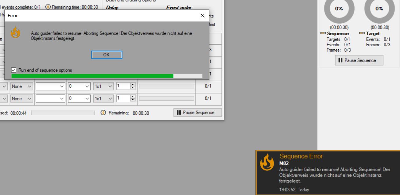 I have sent an email to support@mainsequencesoftware.com with the log. If you don’t have problems but I have problems with the same sequence file, it sounds to me that our SGP setups are something different. Am I correct in assuming that if I select “no autoguider” all other settings elsewhere will be overwritten? Anything else makes no sense to me and would be very confusing.