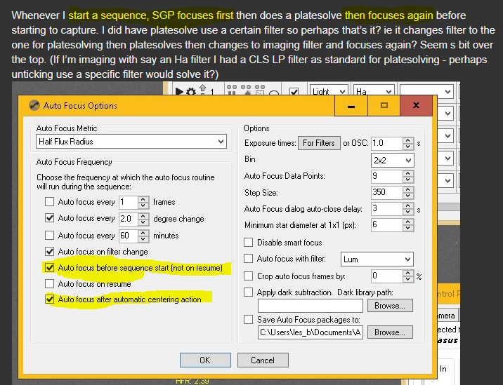 Whenever I start a sequence, SGP focuses first then does a platesolve then focuses again before starting to capture. I did have platesolve use a certain filter so perhaps that’s it? ie it changes filter to the one for platesolving then platesolves then changes to imaging filter and focuses again? Seem s bit over the top. (If I’m imaging with say an Ha filter I had a CLS LP filter as standard for platesolving - perhaps unticking use a specific filter would solve it?)